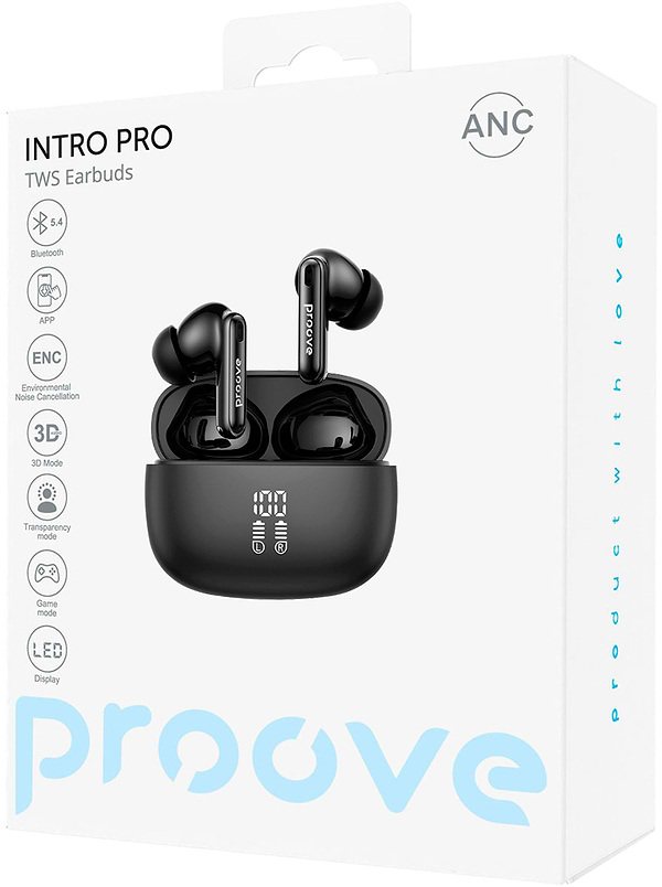 Бездротові навушники Proove Intro Pro TWS Obsidian Black з ANC та APP, Bluetooth, вакуумні, сенсорні, для iPhone та AndroidВ наявності